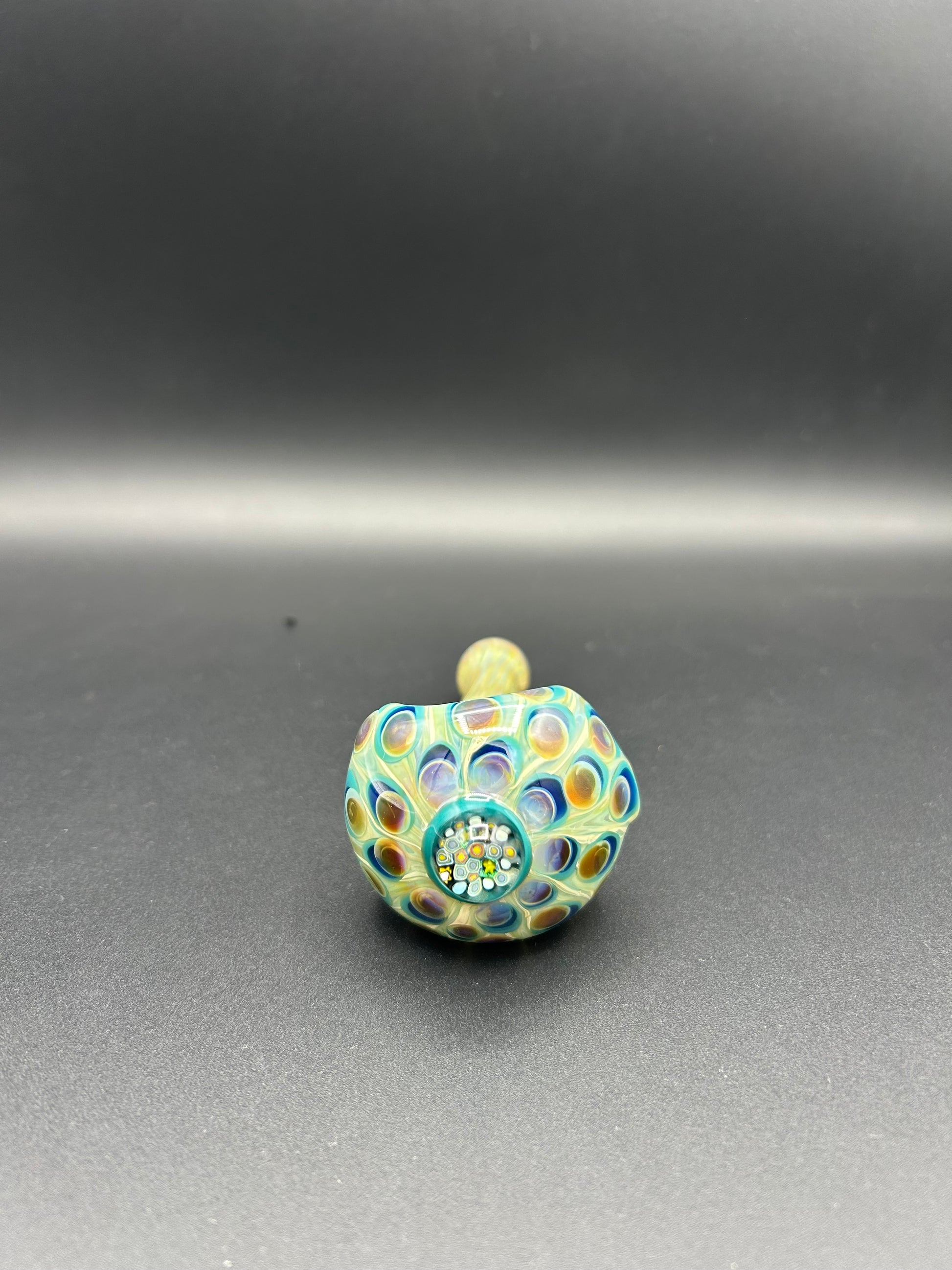 Traditional wrap & rake tech with dot stacking on the bowl. Featuring a stick and snap from @modified creations milli! Colors used are tan silver creek, silver fume, amber purple, green amber purple, and silver aqua.