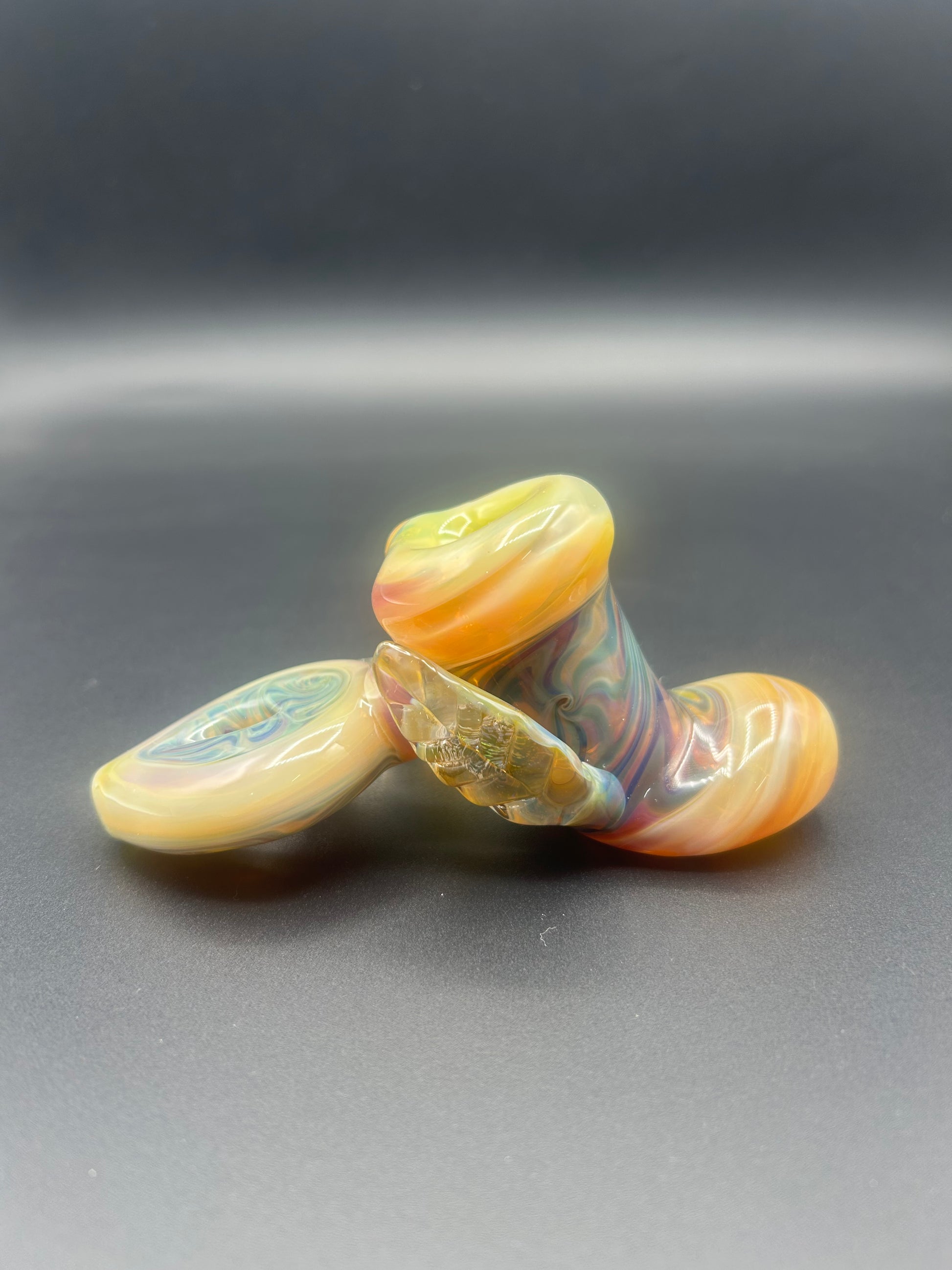 Featuring my first lined tubing pull and Tan silver creek encalmos. This piece has two attachments. A marble from J.zeff glass. As well as a dichro leaf.