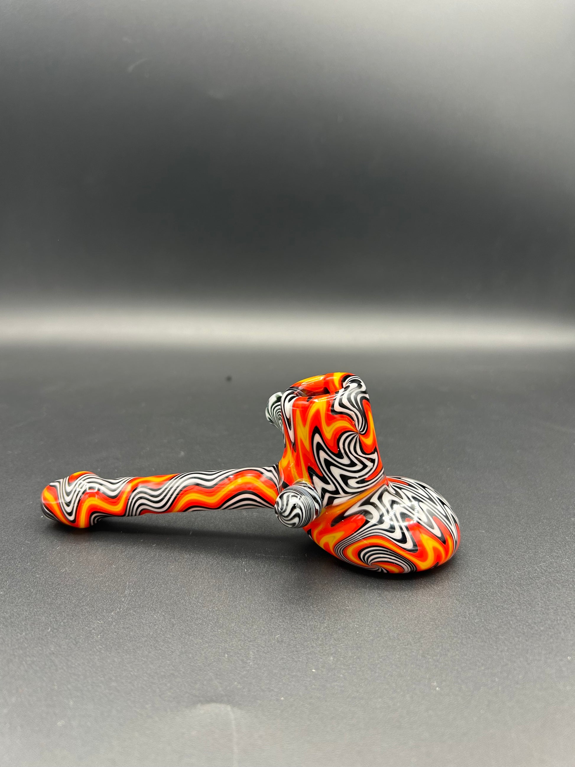 The lined tubing is from @funhouseglass. This piece is 3 sections. All the twists are done by me. Featuring a black and white wig wag attachment and a reversal marble I blew out for the carb.